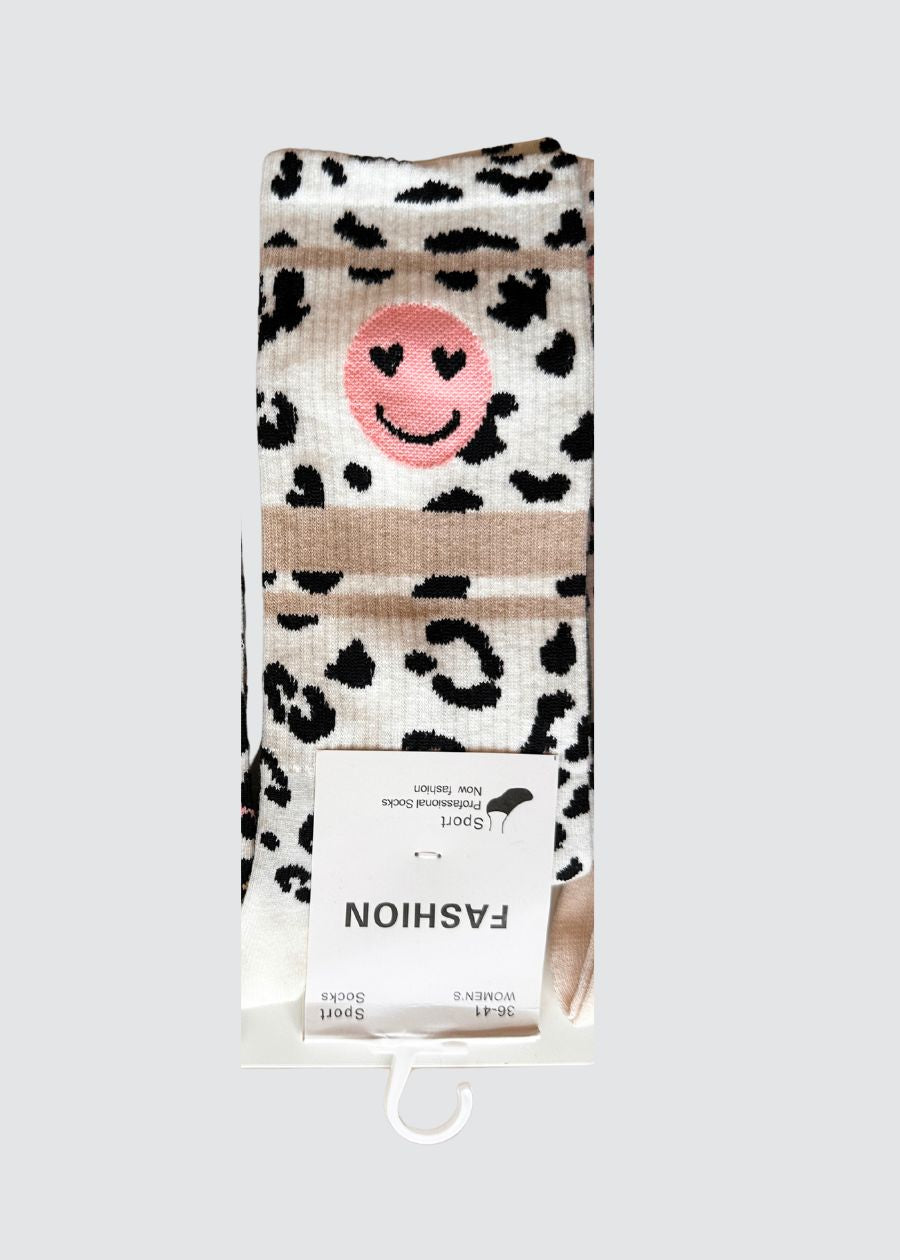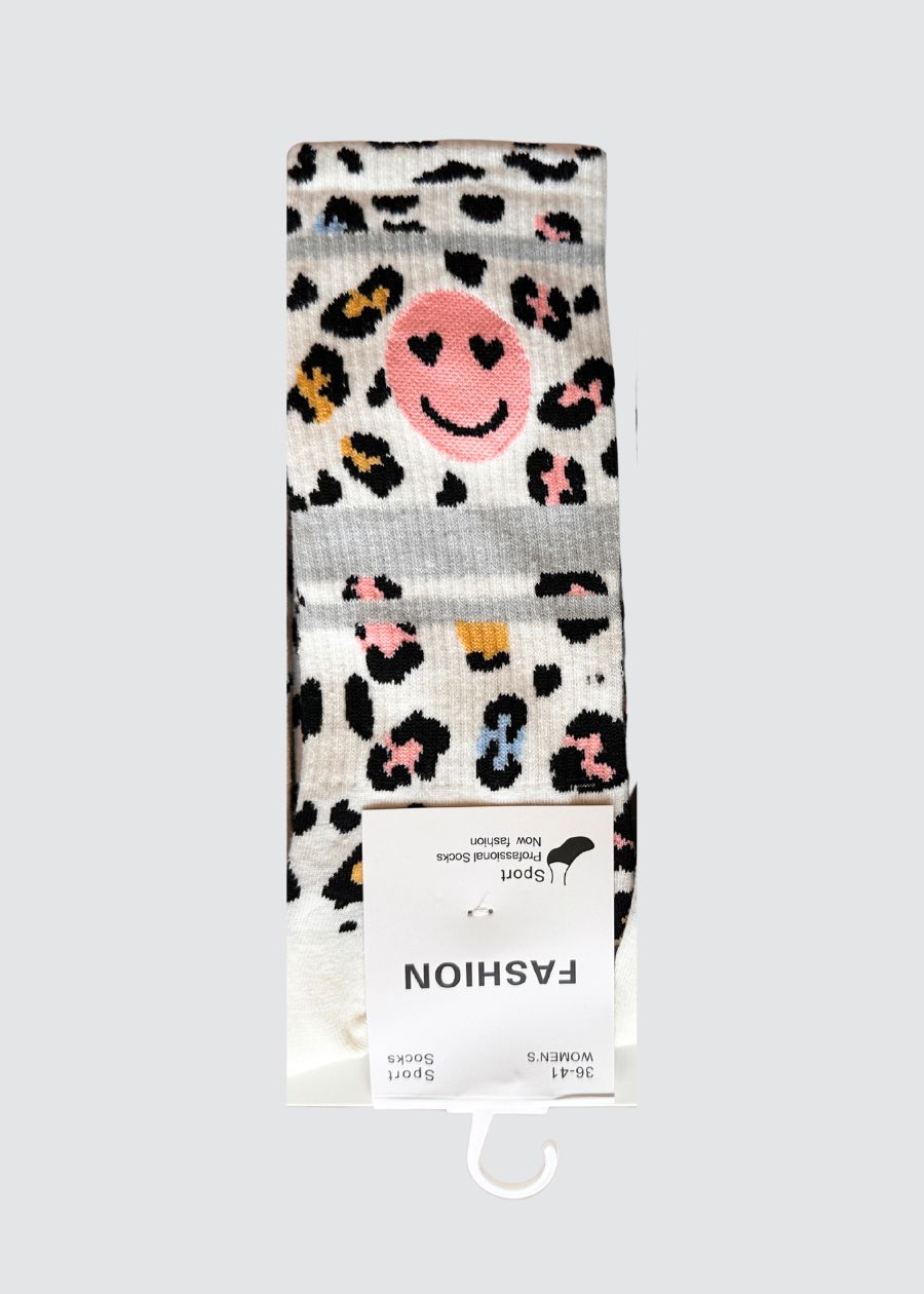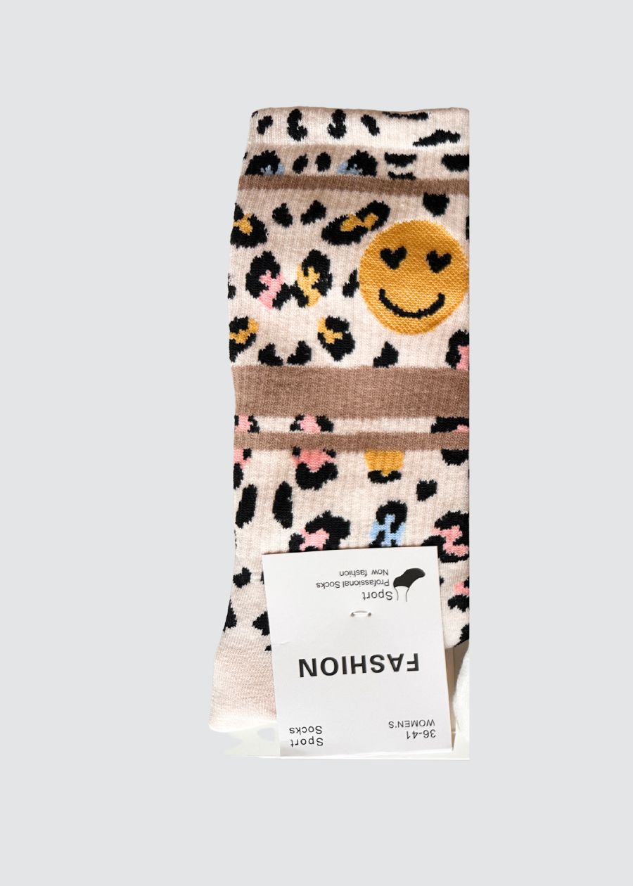 Weiche, elastische Unisex-Socken mit Leo-Print und Smiley-Motiv. Einheitsgröße passend für Schuhgrößen ca. 36–41. Material: Baumwollmischung mit Stretchanteil. Der Smiley befindet sich sichtbar außen am Knöchel. Hinweis: Farbe kann je nach Monitor leicht abweichen. Bitte bei 30 °C waschen. Dieses Produkt ist in limitierter Auflage erhältlich.