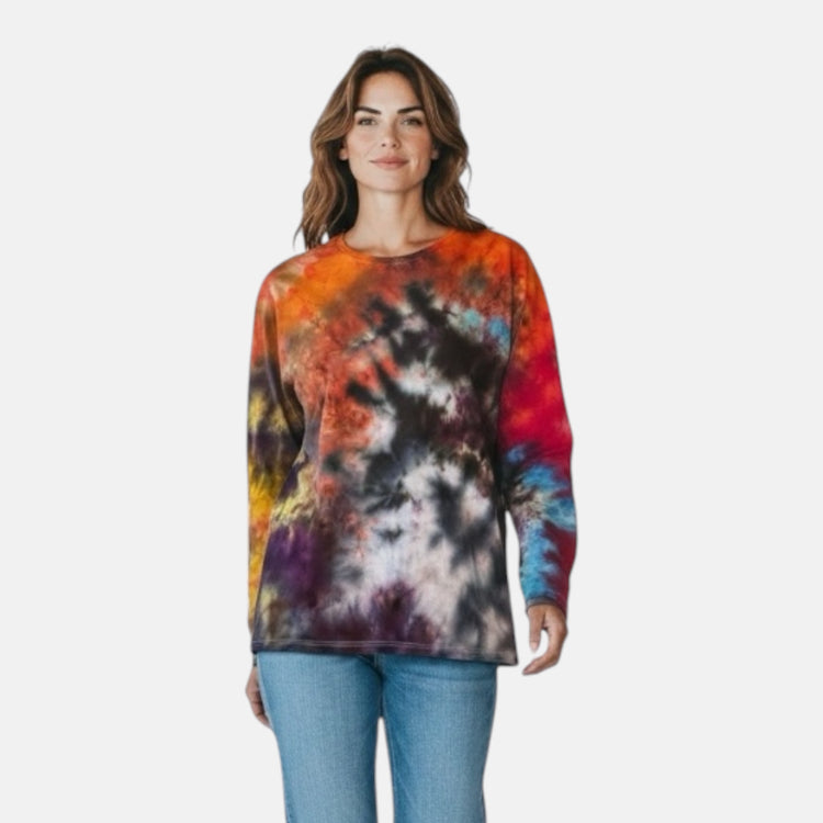 DER LOOK: KONTROLLIERTES CHAOS. Vergiss alles, was du über Standard-Farbmuster weißt. Das „Solar Eclipse Rebel“ Longsleeve ist kein einfaches Shirt – es ist eine visuelle Explosion. Wir haben tiefe, kosmische Schwarztöne mit einem aggressiven Farbspektrum aus glühendem Orange, giftigem Gelb und elektrischem Blau kollidieren lassen. Das Ergebnis? Ein Tie-Dye-Design, das so unvorhersehbar ist wie dein nächster Move.